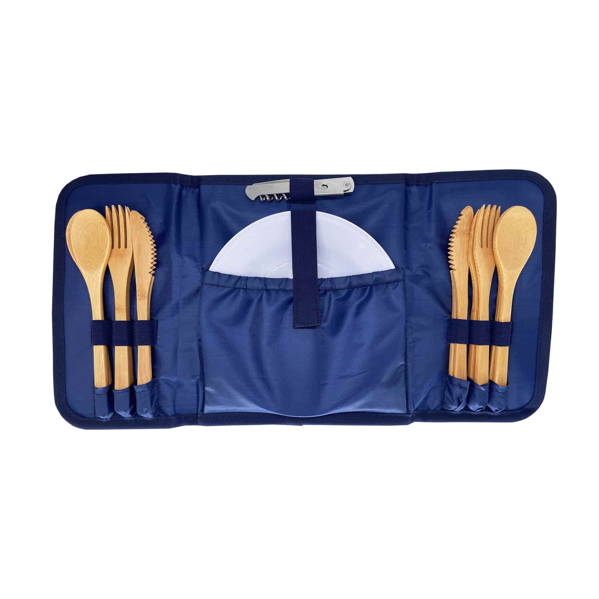 The Sac de Plage picnic tote in Riviera blue is an elegant way to carry food and drink to the beach. The spacious raffia bag has blue and white striped lining and an insulated compartment to keep food and drink cool. Inside, you’ll find four plates, glasses, a corkscrew and a set of bamboo cutlery in a smart blue case.